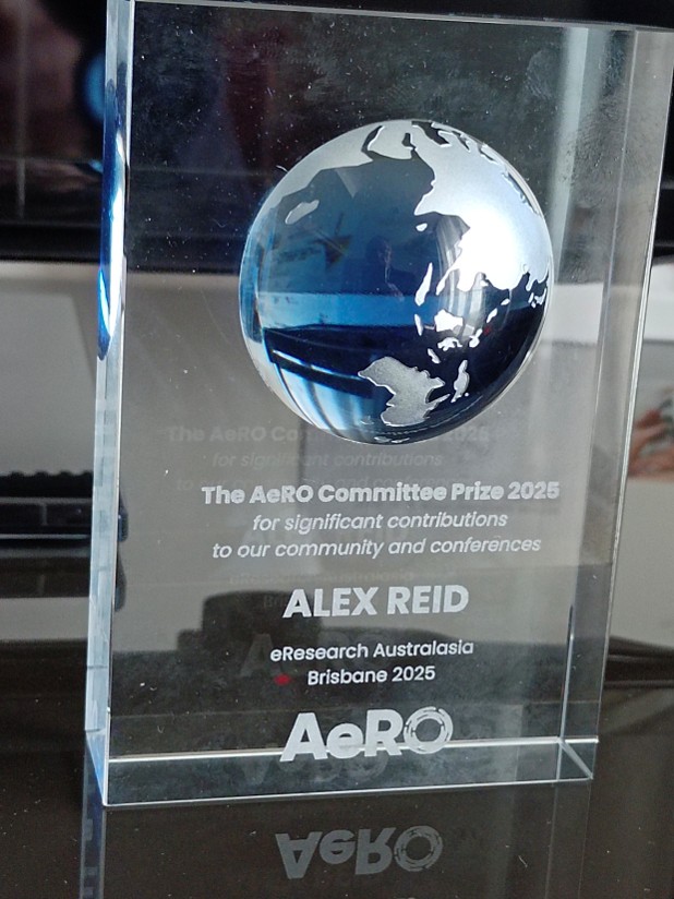 This trip followed on from a 3-day conference in Brisbane, the annual eResearch Australasia Conference, organised by AeRO (Australasian eResearch Organisations); I've attended all but 1 (I think) of these conferences, and been on the Program Committee for many years (co-chairing it twice), and have edited the monthly eResearch Newsletter for the last 10 years (all in an honorary capacity). I was honoured and humbled to be made the recipient of the inaugural AeRO Committee Award, for services to the AeRO community. Here's the award, handed to me at the opening plenary on Wednesday...