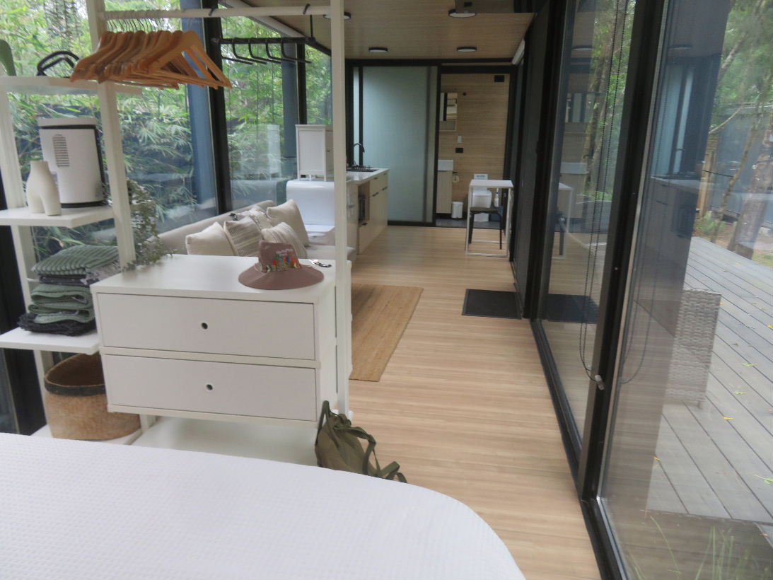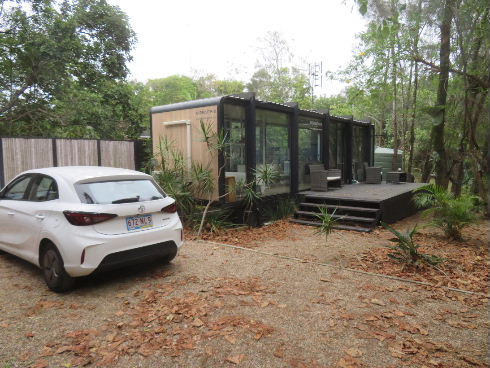 We've moved down the Coast from Tamborine to Brunswick Heads, New Brighton (in NSW, just N of Byron Bay). Exchanged our Tiny Away cabin for a Eco Pod cabin (with lots of glass, so you feel you're actually out in the bush), 50m from the beach - here shown inside and out, along with the Heads, some mangroves near the Heads, and the beach (really was barely more than 50m). Can't readily post from here, as there's no Internet in the pod - but good TV reception.